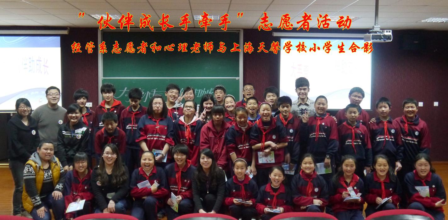 | 在上海济光学院“伙伴成长?手牵手”志愿者项目推进活动中,为增进大学生和中学生交流沟通,帮助和引导中学生积极面对生活与学习,在各方面不断成长进步,经管系党总支、分团委学生会组织大学生志愿者于4月2日下午来到上海天馨学校,与50余名中学生联合举办“大手牵小手,伙伴助成长”的心理健康咨询活动,经管系辅导员周翌军、方平、董羽、郝晓燕都参加了此次活动。 |