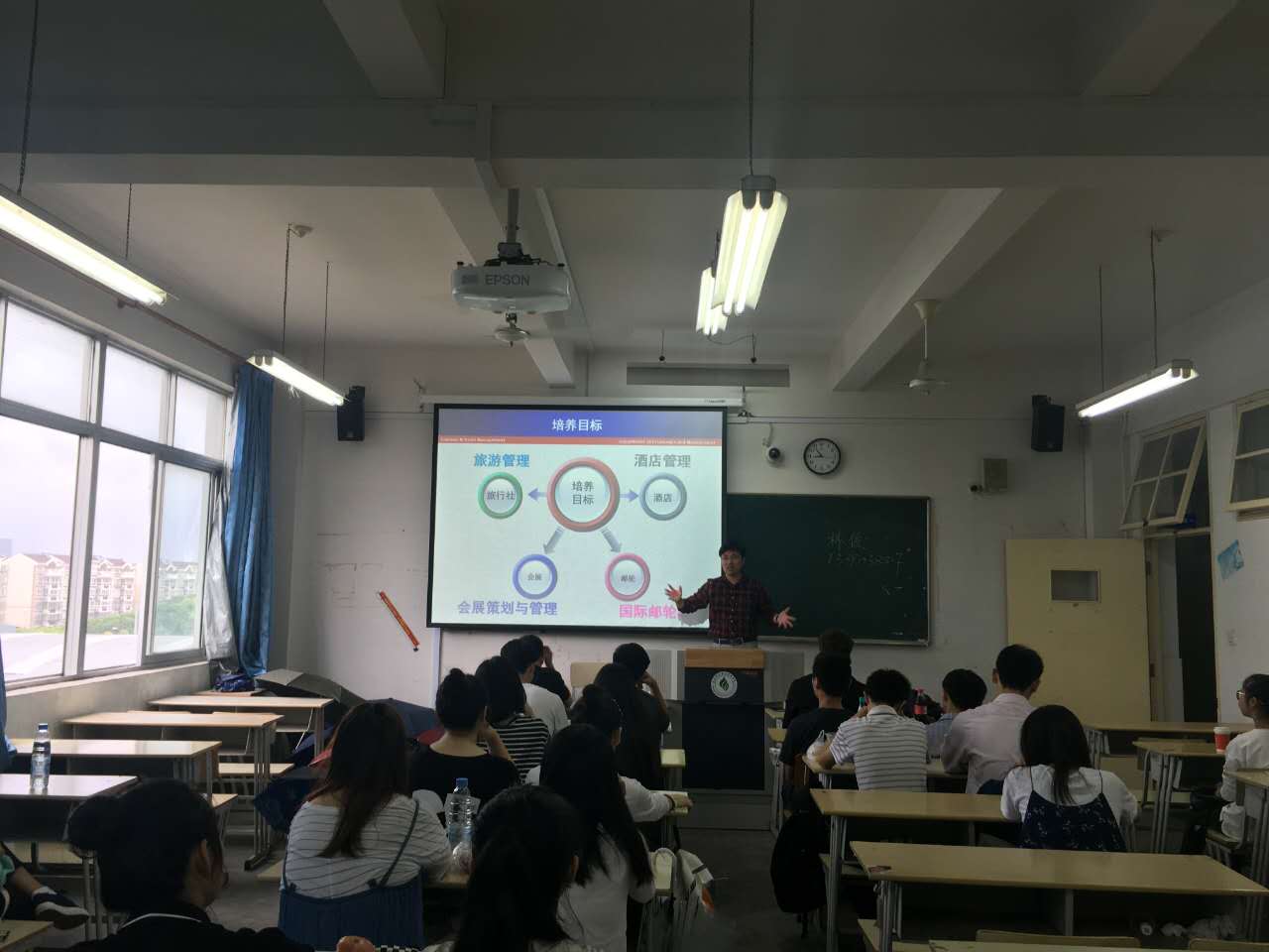 2016年9月14日上午,经管系酒店管理专业主任林俊老师为2016级新生进行专业介绍。首先,林老师对大家的到来表示了热烈的欢迎,欢迎大家来到济光学院进行学习;其次,林老师从酒店行业的发展开始,为大家就本专业设置的背景、教学的主要课程及内容、校内外的实训、实践体系、校外实习、双证书教育、技能大赛、求职就业及职业发展等问题进行了详细的介绍,使同学们对专业及未来三年的学习生活有了一个整体性的了解。随后,又有部分同学针对考证、比赛、实习、就业、专升本等问题与林老师进行了交流。最后,林老师对大家未来三年在学校的学习进行了寄语,希望大家能够学好专业知识和技能,为自己、家庭和社会做出自己的贡献。