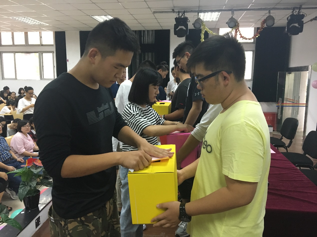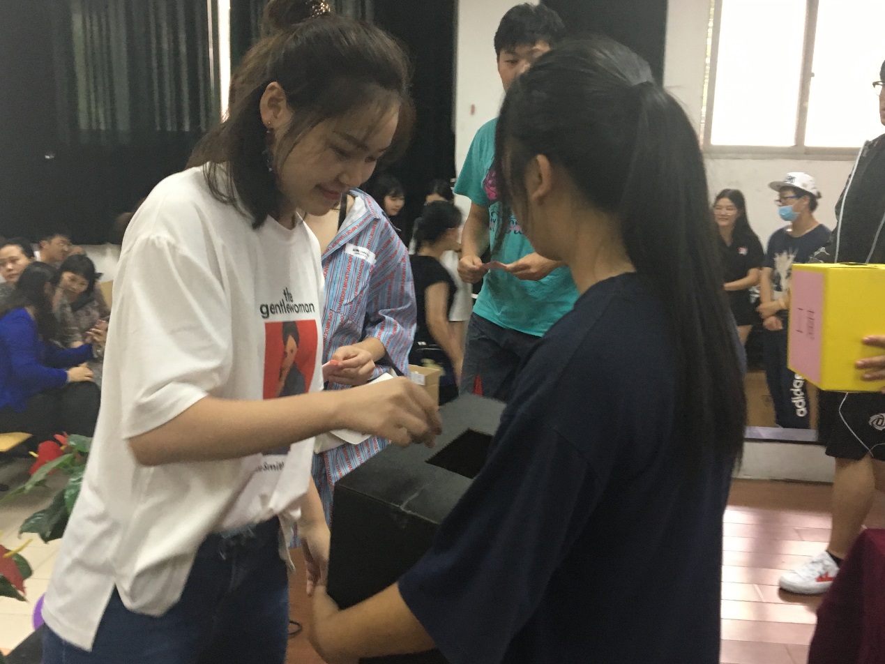 最后环节——播种“理想的种子”仪式,更是将活动推向了高潮。新生进校初期,信心满满,但面对未来的大学生活,他们往往是不知所措。正确的引导,是开启学生心智、设立目标的重要环节。为此,张迺英教授上台亲自主持播种“理想的种子”仪式,活动瞬间点燃了新生们的激情。张迺英教授首先引导同学们要规划大学生活,设定目前可实现的目标,以达到理想;其次,让同学们自己立下三个小目标,争取在大学三年中完成。最后,通过大张旗鼓的仪式——每位同学按专业、班级列队上台,一一将自己的理想卡片投入到各自专业的“种子箱”,以此促使同学们有追求目标的庄严感和神圣感,并在全系新生同学和老师面前立下誓言,从而以自己的行动去努力追求。现场让我们更为感动的是,因生病住院没能亲临现场的四位电商班同学,得知此活动后,给辅导员特地打来电话,表示自己也要写下理想的诺言,希望自己也能够补加入到此活动中,而他们的申请也得到现场师生的一致同意。