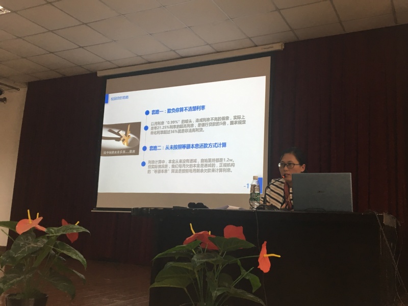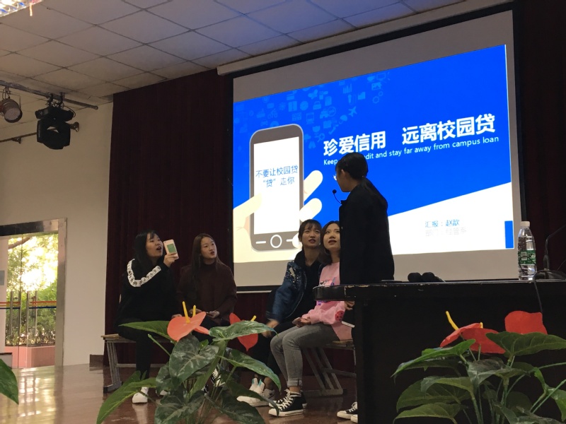 本次讲座由经管系辅导员赵歆担任主讲。讲座一开始,由我校话剧社的同学表演了发生在寝室里的校园贷故事,随后赵歆老师主要从“什么是校园贷”、“校园贷的套路”、“校园贷的危害”这几点为主要方向讲述校园贷。其中令人印象深刻的是在介绍校园贷的套路时,用图表罗列比较了某校园贷APP,蚂蚁花呗和中国银行的利率,直观清晰地为同学们揭露了校园贷在利率里埋下的陷阱,并通过典型的案例为同学们具体深入介绍了利率,砍头息,逾期罚息,介绍了平账等校园贷中的套路。通过这些具体实例劝诫和警示同学们珍惜保护自己的个人信息和信用,防范并远离校园贷。