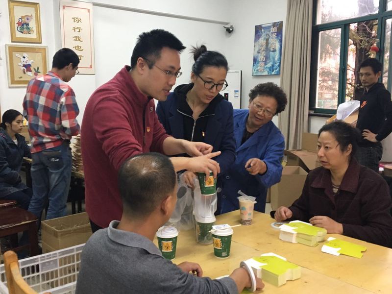 当天下午到达阳光之家后,刚好碰到手工纸制品卸货,党员同志发扬不怕苦不怕累的精神撸起袖子帮他们一起搬上楼,随后为他们送上咖啡馆提供的爱心奶茶和咖啡。学员们洋溢着笑脸一声声道着“谢谢老师”。在帮他们做手工的过程中,党员们体会到了工作的枯燥与辛苦,虽然只是简单的重复劳作却让我们对这群特殊人群心怀敬意。同时也对我们社会能为这样的特别人群提供社会关爱感到欣慰。