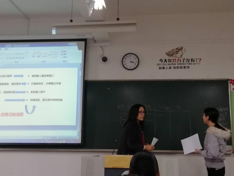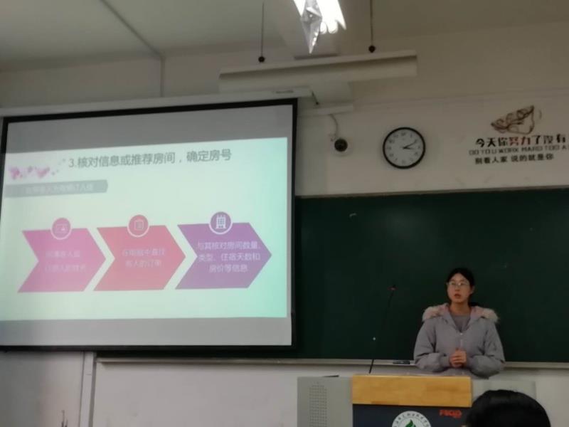 肖菲老师结合“星光杯”酒店前厅接待比赛项目向同学展示了前厅接待的各项环节,从酒店实际管理出发,结合比赛要求,向同学介绍了酒店前厅接待的各项工作流程及操作规范要求。