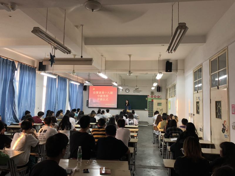 2019年5月29日下午16:30,经管系第十九期中级党校开学典礼在教学楼410教室顺利举行。第一堂课由经管系党总支组织委员陆旻敏老师主讲,主题为“共产党员的条件”。首先,引用了“习近平同志在纪念五四运动100周年大会上的讲话”的部分内容,指出在现今开放包容的时代中,青年朋友拥有了更多的多样化发展的可能,同时,国家对于我辈青年的发展寄予了很高的期望。我们应该珍惜当下的美好生活,努力学习,发奋图强。然后,结合《最新大学生入党培训教材》,给同学们讲解了什么才是正确的入党动机,告诫大家在积极向党组织靠拢的同时,首先要严格要求自己,争做优秀的学生。接着,根据最新的党章,就中国共产党的性质、中国共产党的宗旨以及党员的八项义务,以及申请入党的基本条件等等重要内容展开进一步地讲解。