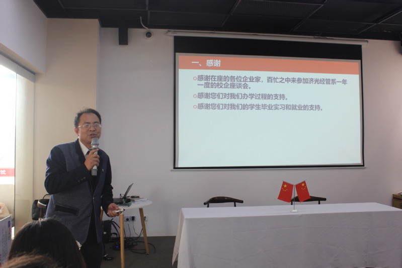 首先,经管系主任张迺英教授致辞。张主任介绍了学院2019年的发展情况及工作成果,肯定校企合作取得成效,对合作企业给予学院各方面的大力支持和帮助表示感谢;希望校企合作模式不断创新,合作关系更亲密、合作形式更丰富、合作内容更广泛;希望校企双方共育人才、共享资源、合作共赢,为各行各业培养更多、更优秀的技术技能型人才。