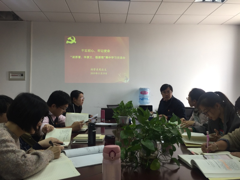 2019年11月19日中午12点30分,全体经管系教工党员在教学楼415会议室集中开展以“不忘初心、牢记使命”为主题的“读原著、学原文、悟原理”的集中学习交流会。