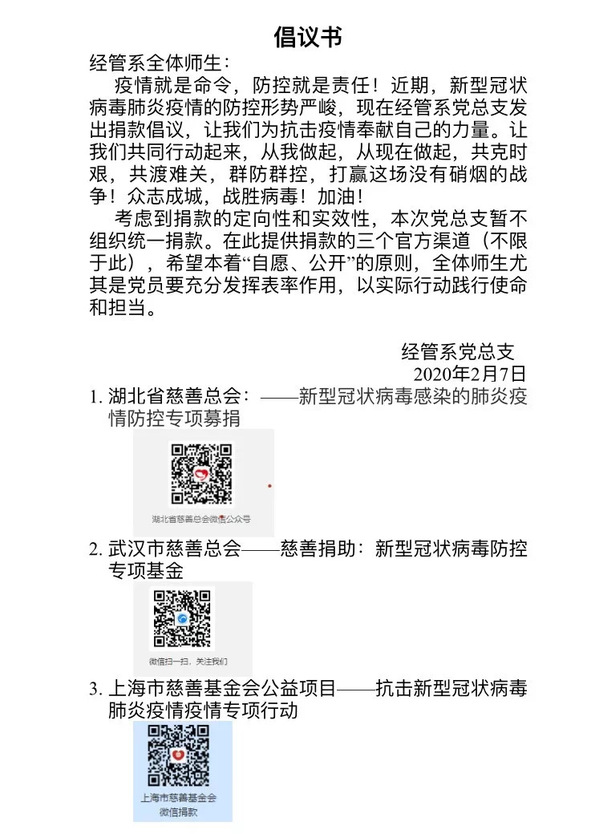 抗击疫情,责无旁贷。2017级工商企业管理班的姜思齐同学在浙江嘉兴嘉善县木业大道320国道北侧卡点担任社区志愿者的工作,在每天的下午四点到凌晨十二点,协助登记往来车辆、量体温、劝返等工作。2017级会计1班的应昊同学,和大部分大三顶岗实习同学一样,结束上海的实习工作后,赶在春节前回到温州,准备和家人迎接鼠年的到来。可是突如其来的疫情让2020年的春节变得非同寻常。疫情牵动着全国人民的心,也牵动着应昊的心。他主动去到居委会贡献自己的力量,戴上志愿者红袖章,按要求佩戴口罩,开始自己的社区志愿工作。他的行动也得到了家人的支持和认可,爷爷也自告奋勇地加入到志愿工作中。2019会计2班的腾格思同学,从2月6日正式开始就在新疆乌苏市乌苏饭店邮政小区门口当志愿者,协助警察并且管理小区里的人员出去核查等信息录入。新冠肺炎疫情时刻牵动着师生的心。尽管不能到一线,但很多师生纷纷通过捐款、捐物的方式表达爱心、助力疫情抗击。而经管系党总支一封倡议书的出现,更是掀起了师生捐助的热情。截止至2月8日,已知晓的师生捐款人次达一百余人次,累计捐款9439.27元。