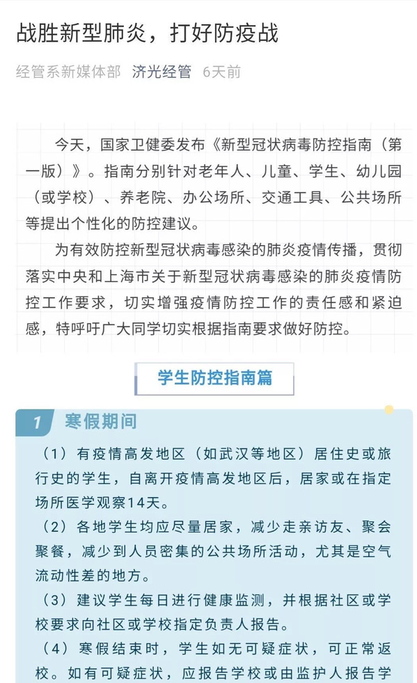 加大宣传,增强师生防控意识。经管系在第一时间通过微信发布疫情防控知识和延迟开学相关通知,并及时转发给全系师生。充分发挥经管系微信公众号平台的积极作用,广泛宣传防控知识,引导师生理性认识疫情,科学进行防范,有效提高师生的防范意识和安全意识。