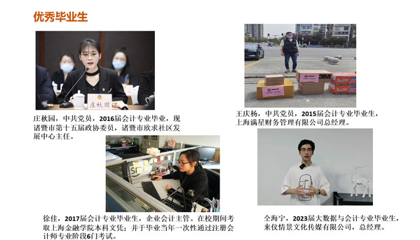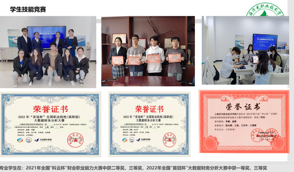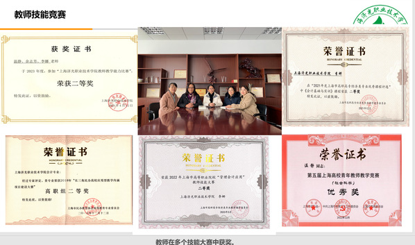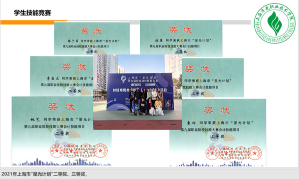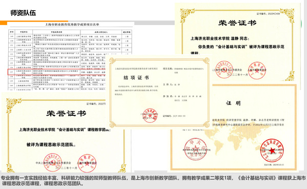 专业特色:本专业拥有上海市创新教学团队,上海市教学成果二等奖,上海市课程思政示范课程1门,是课程思政示范团队。专业培养双层次多方向“零距离”上岗的会计人员,构建基于“岗位需求—职业能力—专业课程”的专业课程体系,教学突出校内实训和校外实践相结合,采用“以赛促学、课证融通”的教学方式,并定期开展丰富多彩的技能竞赛,提高学生的职业素养和专业能力,在各类竞赛中曾获得多个团体及个人奖项。本专业与王琦赟会计师事务所、上海礼才物流有限公司、上海联贝财务咨询集团、上海丰收日等单位建立长期的校企合作关系。