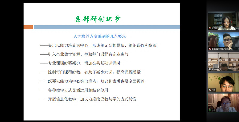 按照《教育部关于职业院校专业人才培养方案制订与实施工作的指导意见》和《上海济光职业技术学院专业人才培养方案制(修)订的改革实施方案》的要求,2020年经管系对各专业人才培养方案进行制(修)订。经过多次与企业、行业专家交流,征询学术委员会专家评审意见,各专业形成2020级人才培养方案初稿。为保证人才培养方案紧密对接科技发展趋势和产业需求,精准对接行业职业标准,2020年6月12日经管系召集系正副主任、专业主任、专职教师、教学秘书、行政秘书等,并特邀请企业和行业专家对人才培养方案进行再次评审,做实做好做精经管系各专业人才培养方案的制(修)订工作。