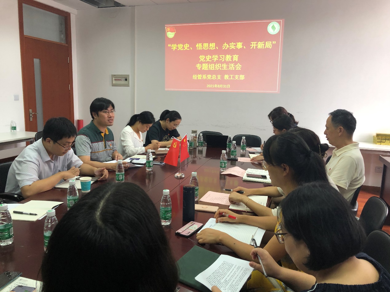 8月31日下午,经管系教工党支部召开党史学习教育专题组织生活会,学院党委书记姜富明莅临指导,经管系系主任张迺英、经管系党总支书记胡春宝、副书记庞菲飞列席参加,会议由教工党支部书记林俊主持。