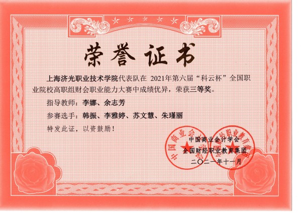 2021年11月20日,由中国商业会计学会、全国财经职业教育集团主办,厦门科云信息科技有限公司承办的2021年第六届“科云杯”全国职业院校高职组财会职业能力大赛在云端成功举办,有近600支队伍参赛。我院经管系师生经过1个多月努力拼博,两个参赛团队分别荣获团队二等奖和三等奖。