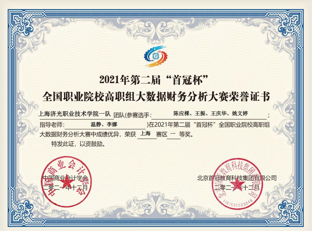 2021年12月5日,由中国商业会计学会主办、北京首冠教育科技集团承办的第二届“首冠杯”全国职业院校高职组大数据财务分析大赛在线上成功举办,全国有近500支队伍参赛。我系会计专业师生荣获上海赛区一等奖和二等奖。
