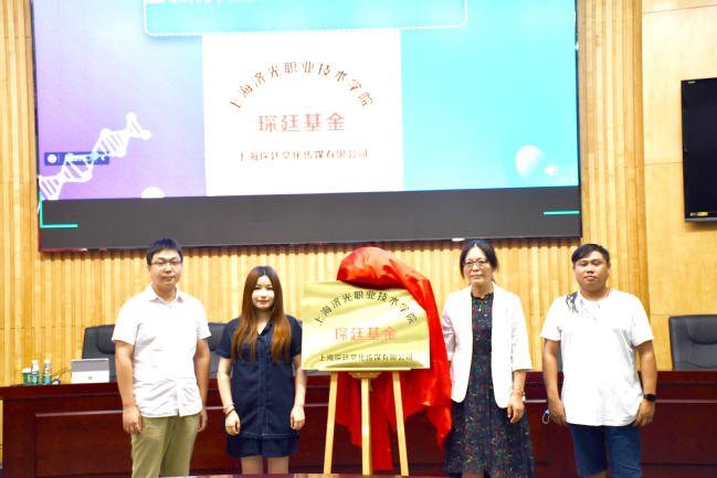 现场,蒲文婷女士隆重宣布上海济光职业技术学院“琛廷基金”成立,经管系主任张迺英教授及电子商务专业主任盛朱勇、琛廷传媒董事长浦雯婷,总经理王玮共同为基金揭牌。